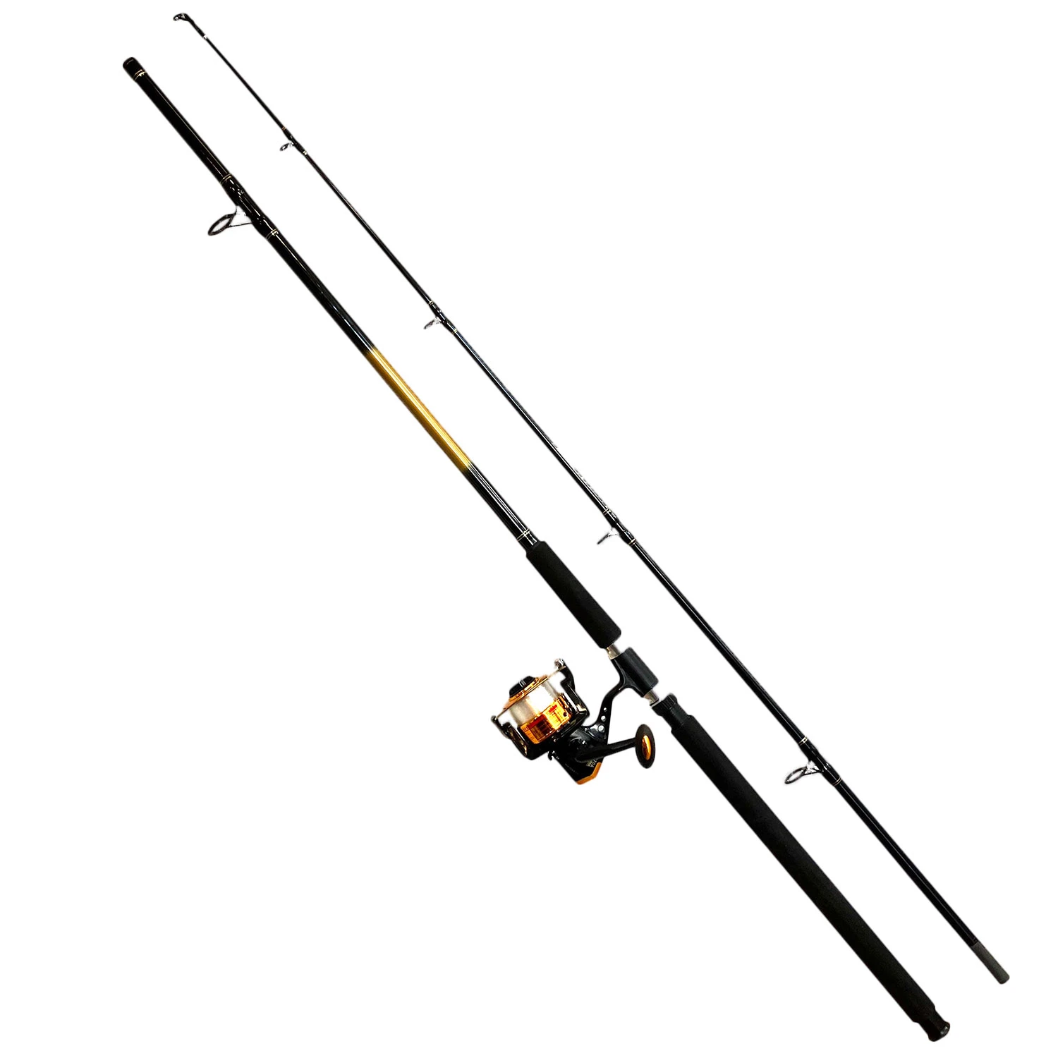 This 2-piece 10′ spinning combo, 1BB, reel comes loaded with 25 lbs. monofilament, front drag.