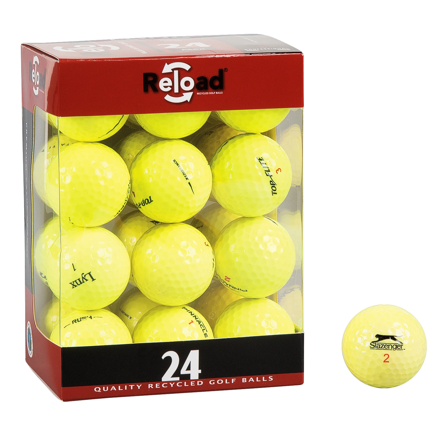 Practice your golf swing without breaking the bank. This 24-pack of recycled golf balls includes a Grade-A quality assortment of various golf brands and models.